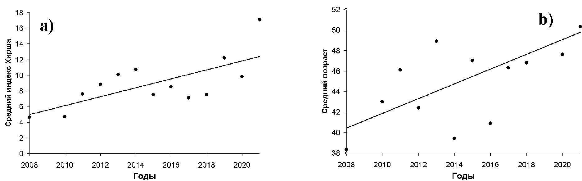 Интересно, что средний индекс Хирша (ИХ) авторов имеет явную тенденцию к увеличению с течением времени – см. Рис. 5а, а это, казалось бы, означает, что в ДОСиГИК с каждым годом публикуются все более опытные авторы. В соответствии с этим, в общем-то, находится и возрастание среднего возраста авторов – Рис. 5b (хотя для него тенденция уже не столь явная). Может показаться, что последнее находится в явном противоречии с заявленной выше направленностью журнала на молодых авторов. Но понятно, что традиционно в научных публикациях наряду с молодым автором участвует и его научный руководитель, подчас весьма преклонного возраста. При этом, учитывая, как было отмечено выше, что половина авторов ДОСиГИК не меняется от года к году, становится понятно, что средний возраст половины авторов с каждым годом увеличивается. Если значительная часть другой половины представляет собой молодых авторов, то ее средний возраст можно принять постоянным. На основании этих простых рассуждений можно сделать вывод, что средний возраст авторов должен возрастать за год примерно на 0.5 года. Из Рис. 5b видно, что возрастание шло несколько быстрее, но так и должно быть, поскольку среди новых авторов нет-нет да и оказываются убеленные сединами корифеи.