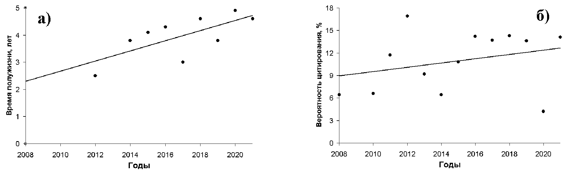 Безусловно положительной следует признать тенденцию к возрастанию времени полужизни статей журнала ДОСиГИК в течение последних 10 лет (Рис. 6а). При этом может показаться странным, что динамика такого важного параметра, как «вероятность цитирования статьи после прочтения» (ВеЦиПоП) – Рис. 6b, существенно более хаотична. На самом же деле никакого парадокса в этом нет, поскольку время полужизни рассчитывается по цитированиям статьи независимо от того, из какого источника цитируемая статья была получена, а ВеЦиПоП рассчитывается только для статей журнала, прочтенных на eLibrary. Разумеется, статья может быть получена не только на eLibrary, но и из иных источников: на сайте издательства «Эко-Вектор», в сети ResearchGate и др.