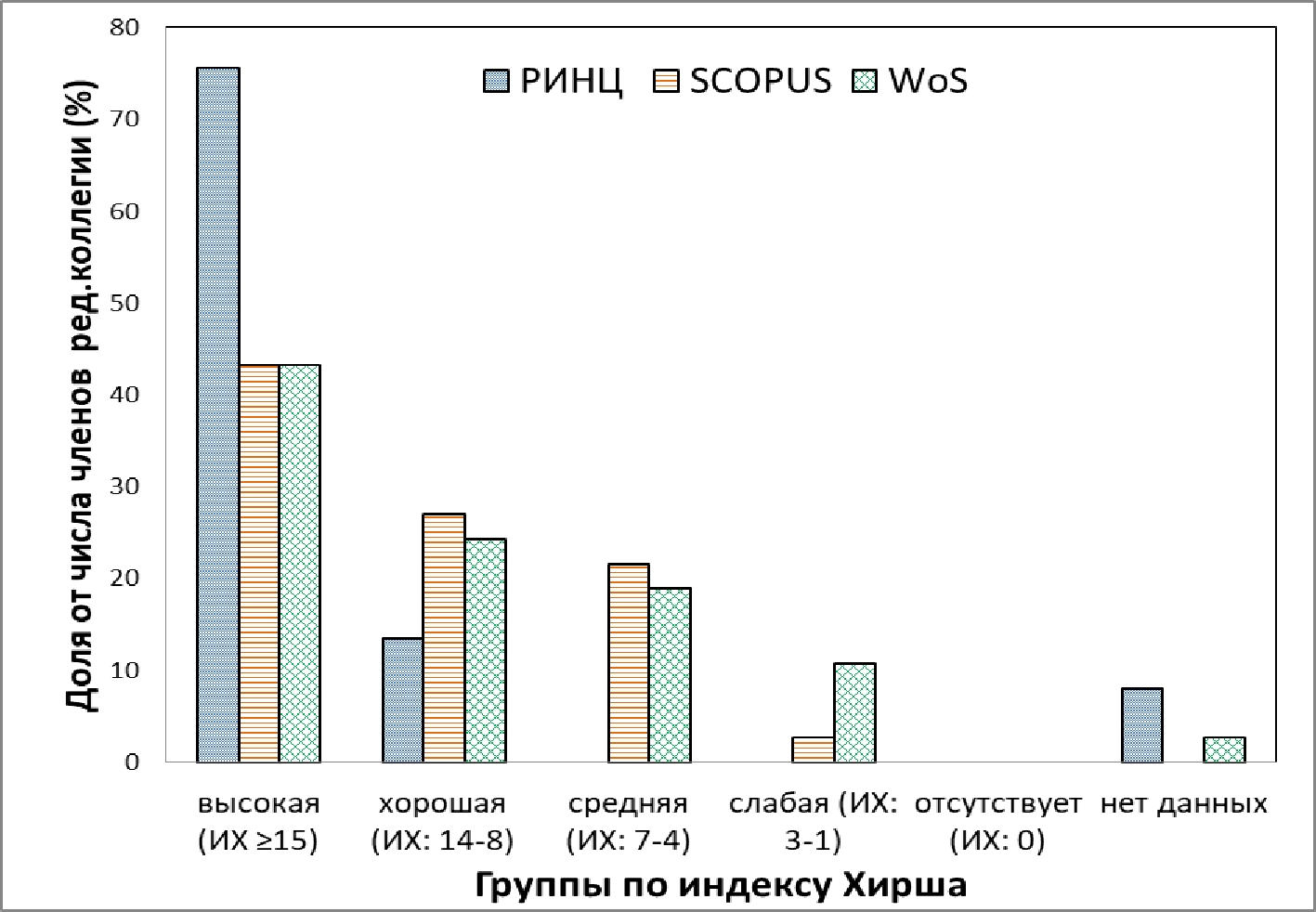 На Рис. 7 приведена оценка показателей публикационной активности членов редакционной коллегии журнала ДОСиГИК. В использованной методике12 [Methodology…, 2017; Mazov, Gureev, 2018] выделяются пять групп публикационной активности: высокая активность, если индекс Хирша ≥ 15; хорошая – если индекс Хирша находится в интервале от 8 до 14; средняя – если индекс Хирша от 4 до 7; слабая – если индекс Хирша 1¸3, а при нулевом индексе активность считается вообще отсутствующей. Расчет проводился на основе данных о публикационной активности членов редколлегии, отраженной в РИНЦ, SCOPUS и WoS. Из Рис. 7 видно, что более 70% членов редколлегии имеют высокую активность (по данным РИНЦ), а более 40% – даже по данным SCOPUS и WoS. Более того, в редколлегии вообще не оказалось членов со средней или хотя бы слабой активностью (по данным РИНЦ), и лишь незначительная доля таковых – по данным более «строгих» библиографических систем (соответственно, менее четверти – по данным SCOPUS и менее трети – по WoS).