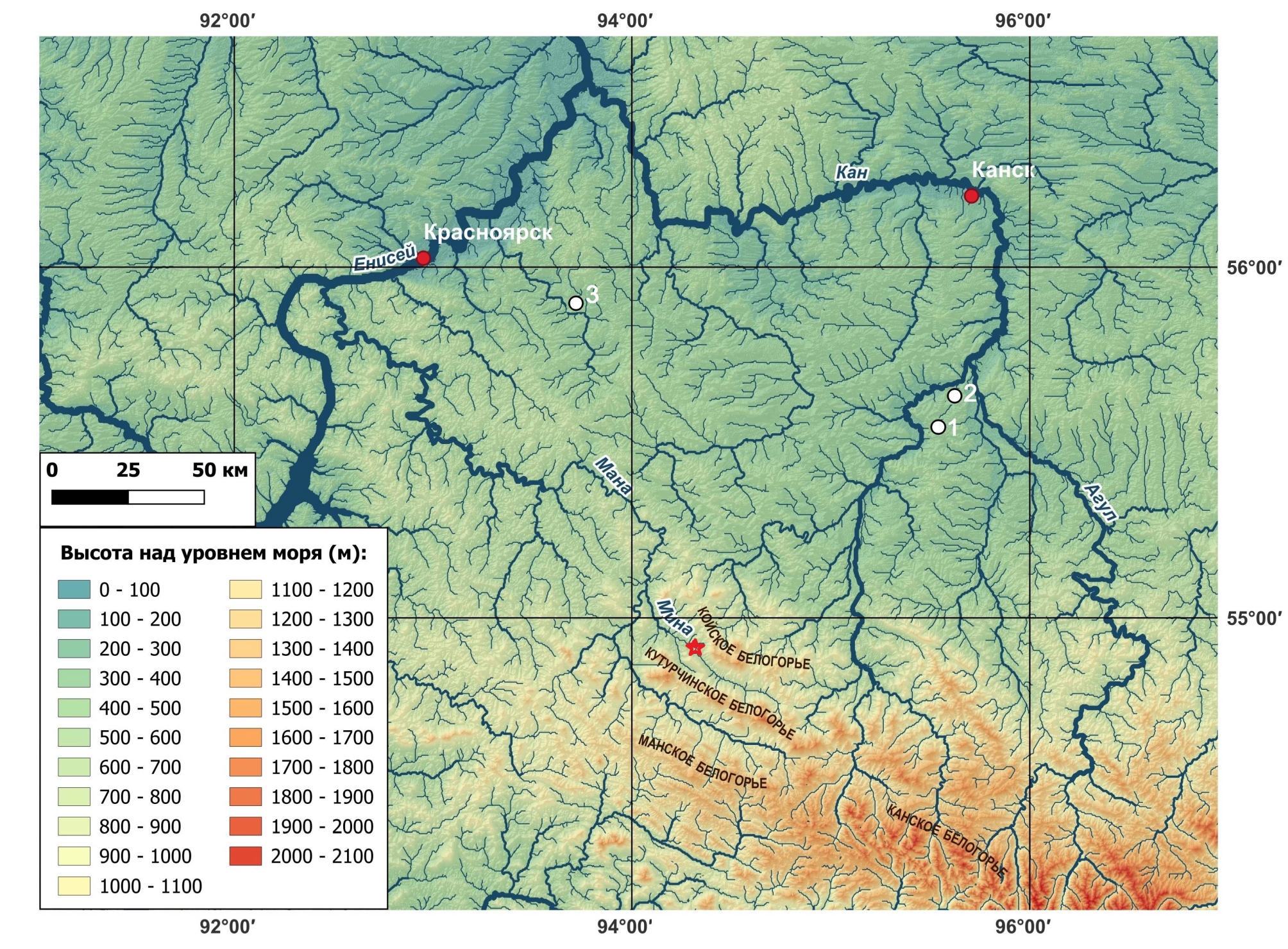 Река Мина является крупным правобережным притоком р. Мана, бассейн которой занимает значительную площадь северной части Манско-Канского района низких гор (рис. 1). Район характеризуется сочетанием максимальной для Восточного Саяна густоты водотоков – 0.68-0.7 км/км2 и минимальной величины падения русла – 2.3 м/км. Длинные (до 3 км) участки врезания русла в коренные породы чередуются с участками меандрирования, в пределах которых происходит aккумуляция аллювия [Nikolaev, Chernov, 1988].