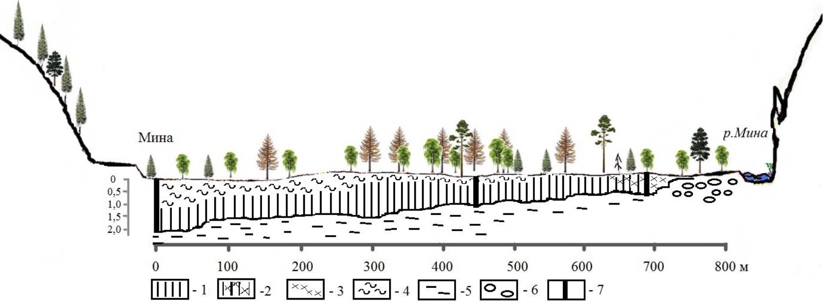 Рис. 2. Схема поперечного профиля болота в пойме р. Мина. Торф: 1 – древесный, 2 – древесно-хвощевой, 3 – хвощевой, 4 – сфагновый, 5 – суглинок, 6 – галечник, 7 – колонки отбора на детальный ботанический анализ торфа.