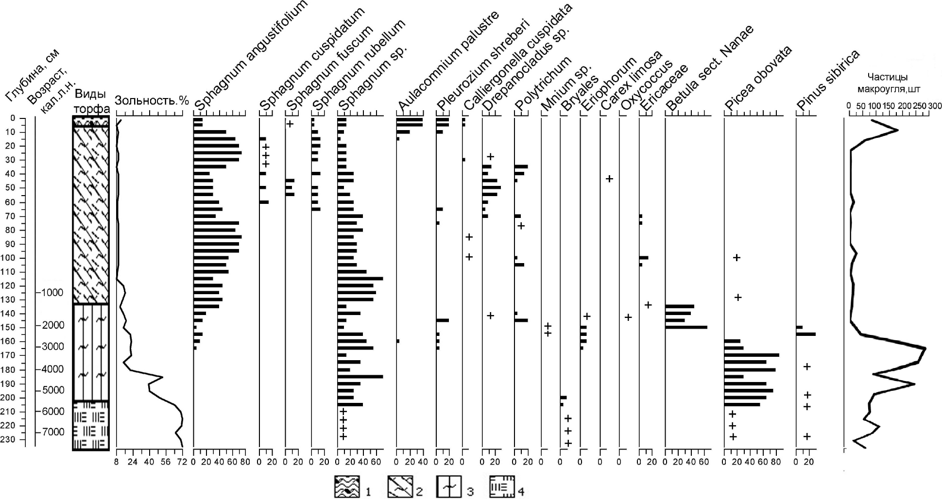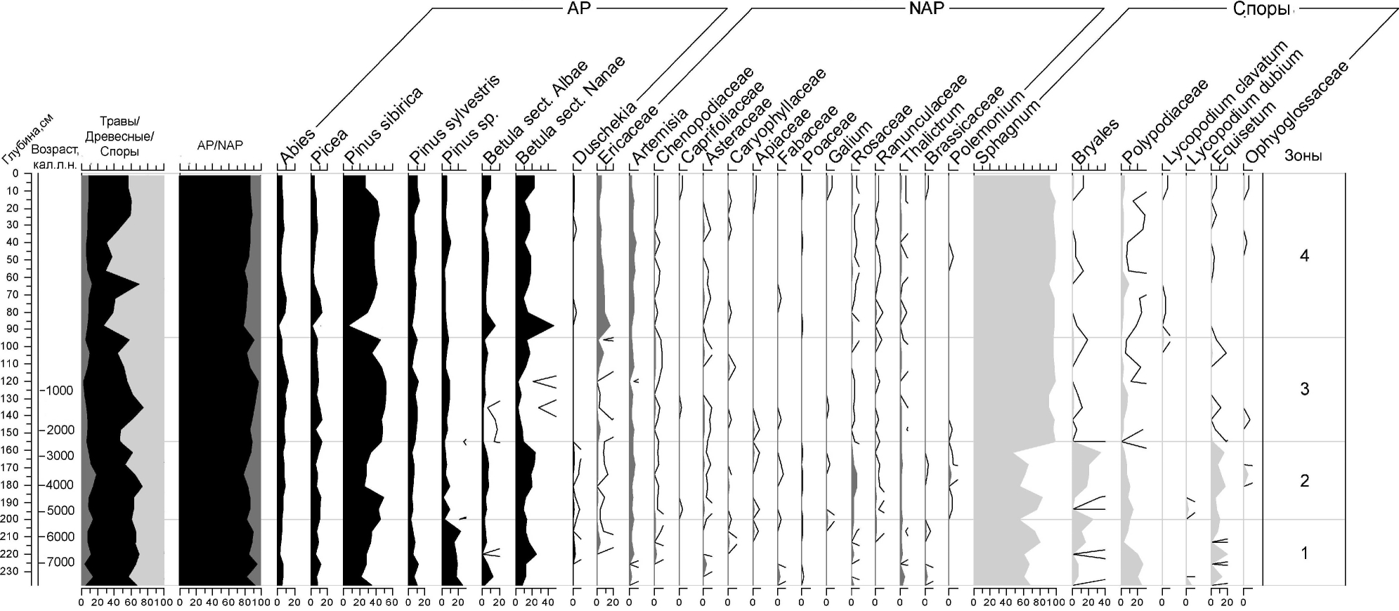 Палинозона 4 (0.96-0.0 м; 0.8 тыс. л.н. – настоящее время). Основной фон в палиноспектрах по-прежнему составляет пыльца деревьев (86%). Pinus sibirica сохраняет преимущество, но доля ниже, чем в предыдущих зонах. Содержание пыльцы Picea и Abies по 4-7%, за исключением интервала 0.80-0.64 м (620-500 кал. л. н.), где отмечено увеличение ели и пихты до 10 и 14% соответственно. В интервале 0.88-0.80 м (около 690-620 кал. л. н.) фиксируется относительно низкая концентрация пыльцы по сравнению с остальными пробами, участие темнохвойных пород в сумме составило 11.8%, содержание Betula sect. Nanae в составе данного спектра достигает 47.6%, а Ericaceae – 16%. В целом в этой палинозоне сопутствующее положение в группе трав и кустарничков занимают пыльцевые таксоны Artemisia и Ericaceae (3-7%). Присутствуют единичные пыльцевые зерна представителей семейств Chenopodiaceae, Rosaceae, Ranunculaceae, а также рода Thalictrum. Среди споровых растений, как и в палинозоне 2, абсолютный доминант – Sphagnum (91-98%).