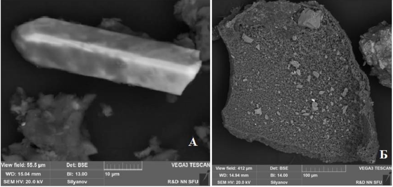 Fig. 4. Micrograph of a sample from the interval of 1.87-1.81 m (4.5-4.1 thousand cal. years ago). A – zircon crystal 55 μm in size, B – particle of charred wood. The determination was made using the OxfordX-Act energy-dispersive microanalysis system, which is part of the TESCAN VEGA 3 SBH scanning electron microscope in the R&D center of Norilsk Nickel SFU.