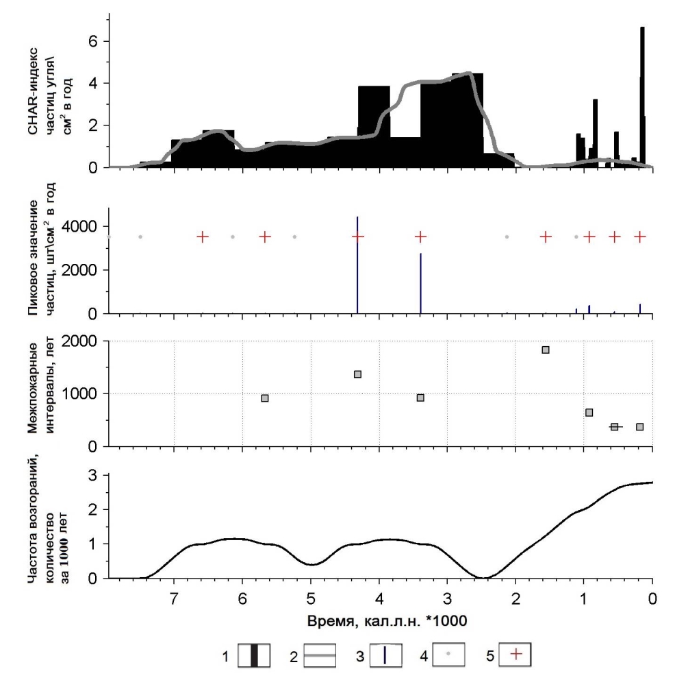 Полученные схемы демонстрируют скорость аккумуляции макроскопических частиц угля (CHAR), локальные пожарные эпизоды и интервалы повторения пожаров в заданном временном отрезке (рис. 4). Локальный пожарный эпизод (“+”) отражает первичное отложение древесного угля от пожара и/или серии пожаров, находящихся в радиусе от нескольких десятков-сотен метров [Clark et al., 1998] до 3 км [Higuera, 2009] от объекта исследования.