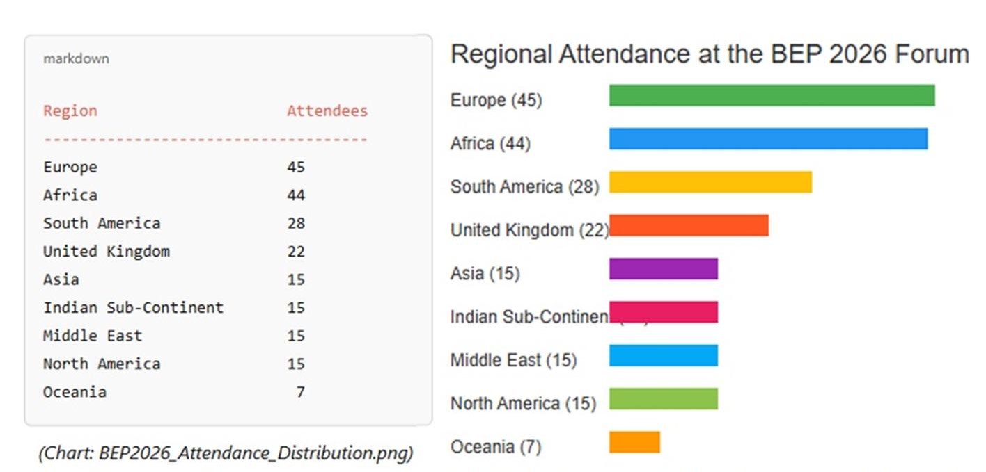 Figure 2. Regional Attendance at the BEP 2026 Forum: This horizontal bar chart shows the distribution of over 200 delegates who attended the Blue Earth Project forum, broken down by region—with the United Kingdom shown separately. Europe and Africa each led with approximately 45 attendees, while the UK alone contributed 22 delegates—a notable turnout considering it represents a single nation. South America followed with 28, and strong participation also coming from Asia, the Indian Sub-Continent, the Middle East, and North America (approximately 15 each), with Oceania contributing 7.