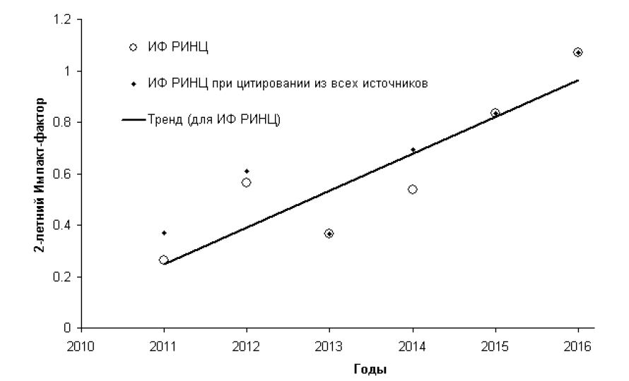 На рис. 1 приведена динамика 2-летних ИФ (РИНЦ) – обычного5 и учитывающего цитирования из всех источников. Не может не радовать устойчивый положительный тренд: за пять лет ИФ ДОСиГИК вырос примерно в пять раз, что позволило нашему журналу занять достойное место среди других журналов сходной тематики (табл. 1).