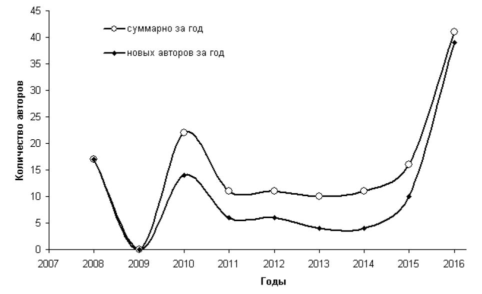 Рис. 4. Динамика количества авторов ДОСиГИК (по данным eLibrary на 04.02.2018).