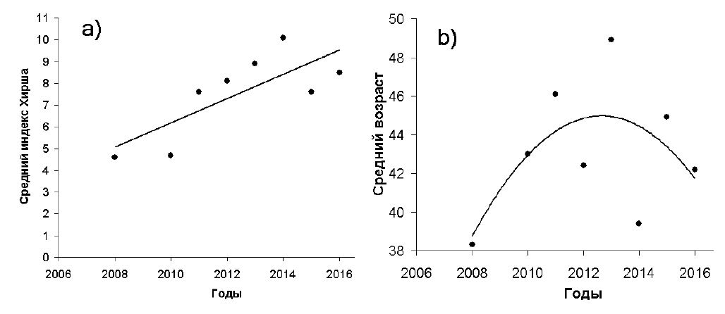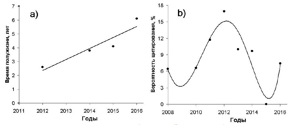 А вот средний индекс Хирша авторов, безусловно, имеет тенденцию к увеличению с течением времени – см. рис. 5а. При этом важно отметить, что средний возраст авторов (рис. 5b) статей 2008-2011 гг. (42.5 ± 3.9 года) статистически значимо6 не отличается от возраста авторов 2012-2016 гг. (43.6 ± 3.6 года). Но у первых средний индекс Хирша составлял 5.6, а у последних – 8.6. Таким образом, можно предположить, что пришли авторы новой генерации, которые (в том же самом возрасте, что и первые авторы ДОСиГИК) оказались существенно более квалифицированными. Возможно, по этой причине такая важнейшая характеристика статей, как «время полужизни статей из журнала, процитированных в текущем году» (ВПоС) все время возрастала – см. рис. 6а.