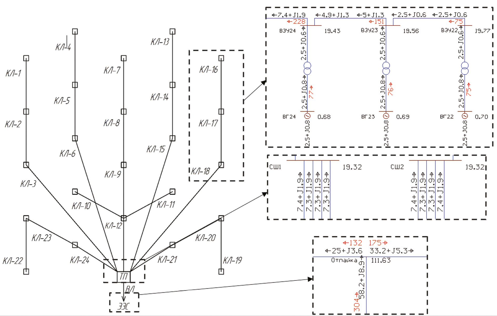 2. Рис. 1. Коллекторная сеть ветропарка и фрагментарные выноски его максимального режима работы