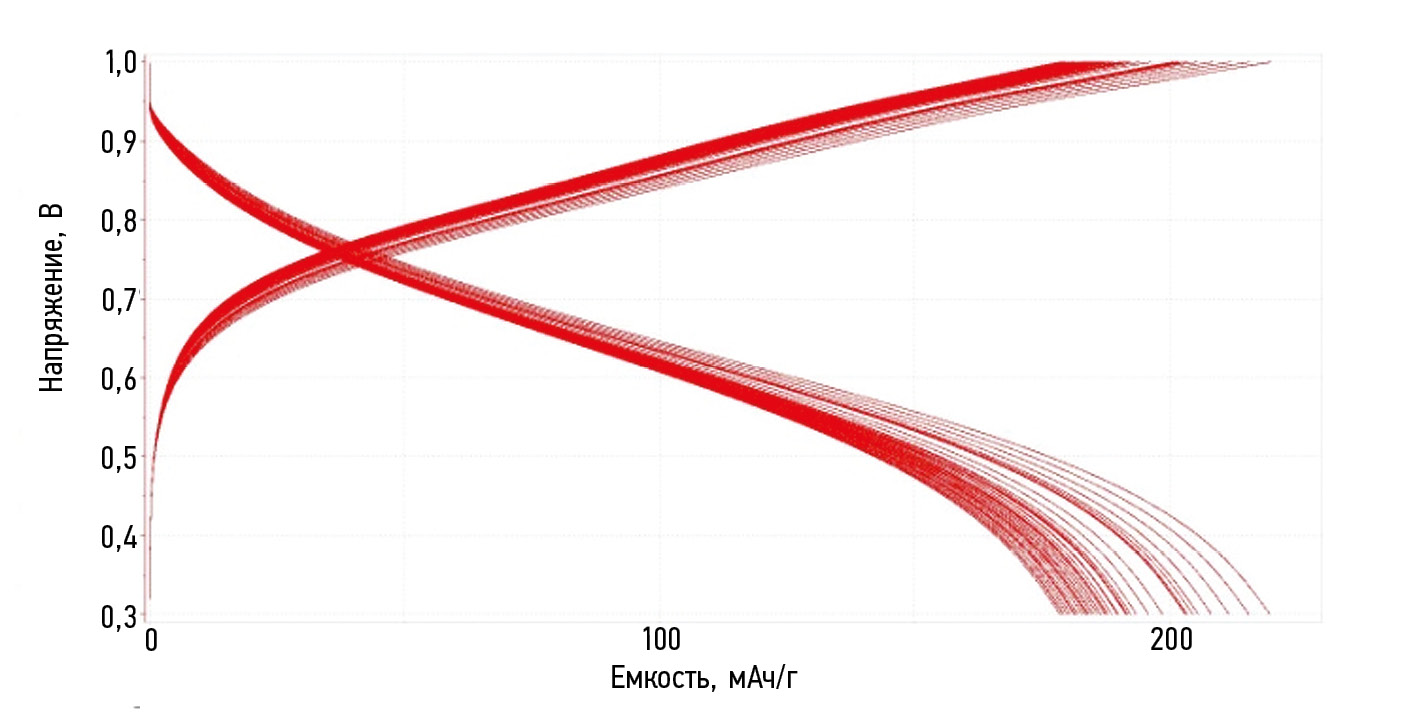 Результаты. Для всестороннего исследования материала было сделано несколько ЭП с различными параметрами, а именно: различные соотношения компонентов катодной пасты ZnV2O4 : Csuper P : PVDF (80 : 10 : 10; 70 : 20 : 10); предварительный помол катодного материала в шаровой мельнице для повышения активной площади поверхности; нанесение двойного слоя катодной пасты на токоотвод; катодная паста с дополнительной гомогенизацией перед нанесением. Исследование методом гальваностатического заряд-разряда показало, что при токе 1 мА на 10-м цикле материал демонстрирует емкость 200 мАч/г, которая в течение 100 циклов убывает до ~170 мАч/г. Также вклад углерода как материала для повышения электропроводности имеет большое значение и повышает емкость аккумулятора более чем на 20 %, при увеличении его концентрации на 10 %масс.