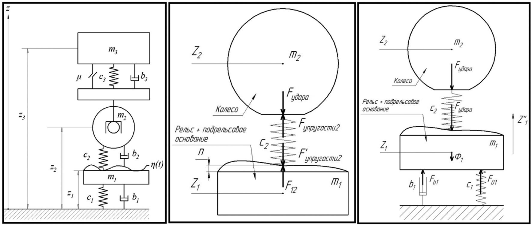 Рис. 1. Расчетная схема рельс-колесо-кузов вагона (слева), расчетная схема определения силы удара по деформации (в центре) и по ускорению рельса (справа)