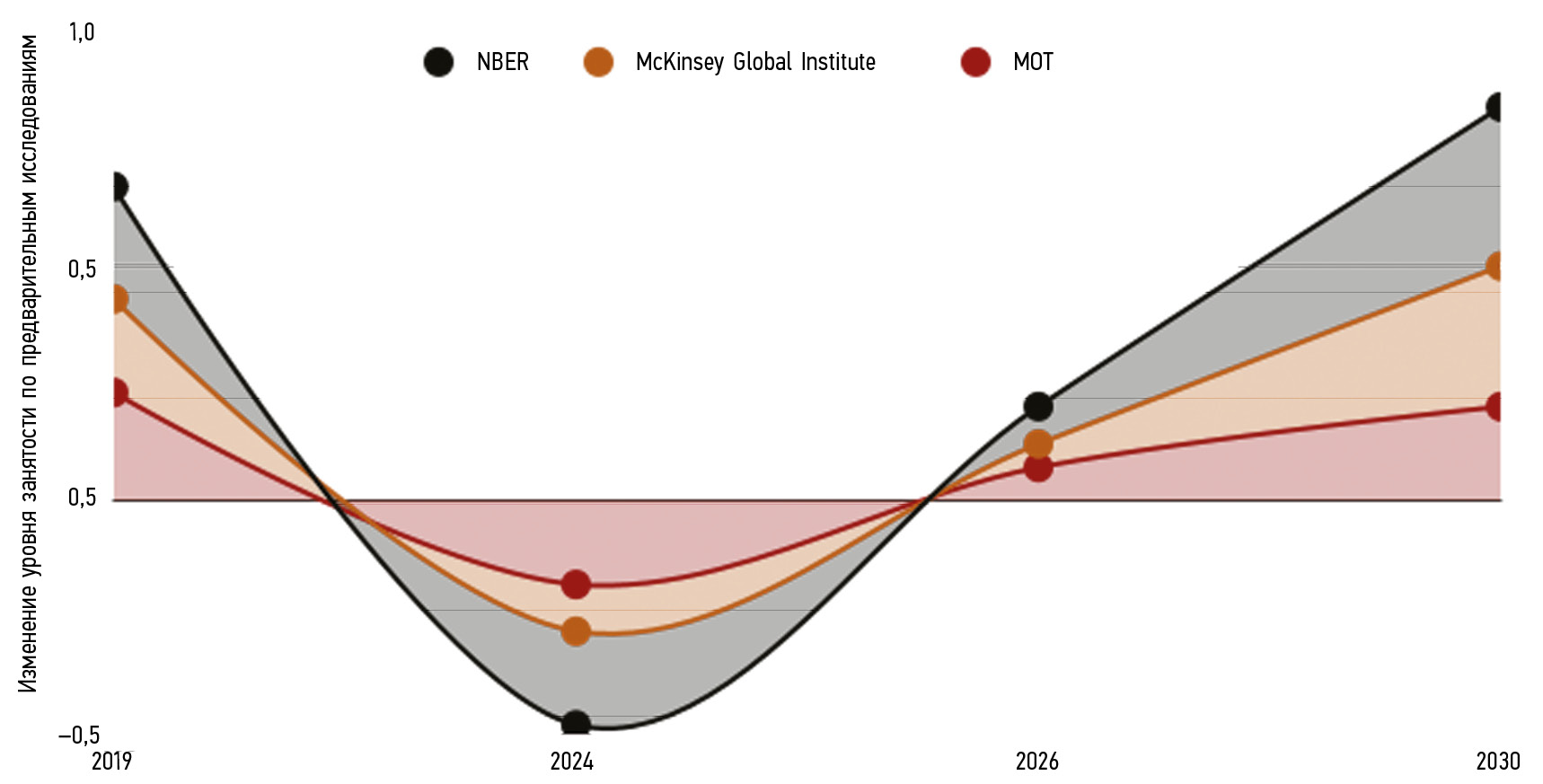 Методы. 1. Анализ современных трендов с использованием графиков. Как показывает исследование Международной организации труда [4], около половины рабочих мест в развитых странах могут быть заменены автоматизацией за следующие десять лет. Исследования McKinsey Global Institute [5] прогнозируют, что к 2030 году автоматизация может затронуть до 800 миллионов рабочих мест. В то же время NBER утверждает [1], что искусственный интеллект может создать до 2,3 миллионов новых рабочих мест к 2025 году. Исследования показывают, что использование ИИ может привести к сокращению рабочих мест на рынке труда. Каждый график, представленный в данных исследованиях, напоминает кривую Аутора, отражающую востребованность специалистов в зависомости от сложности их компетенций.