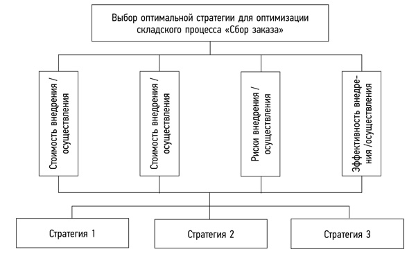 Методы. Многокритериальная экспертная оценка как метод — это практика разделения проблемы на более понятные составляющие и последующего повторного изучения серии экспертных заключений. Этот процесс состоит из нескольких этапов. На первом этапе создается иерархия, включающая цель, набор оцениваемых стандартов и выбираемые объекты, цели оценки и выбора [1]. Данный метод будет использован для выбора стратегии оптимизации складского процесса «сбор заказа» для АО «Фармперспектива». Эта компания — дистрибьютор фармацевтических средств. Дальнейшее изложение построено следующим образом: описываются критерии выбора, проводятся парные сравнения критериев, синтез глобальных приоритетов и выбор стратегии.