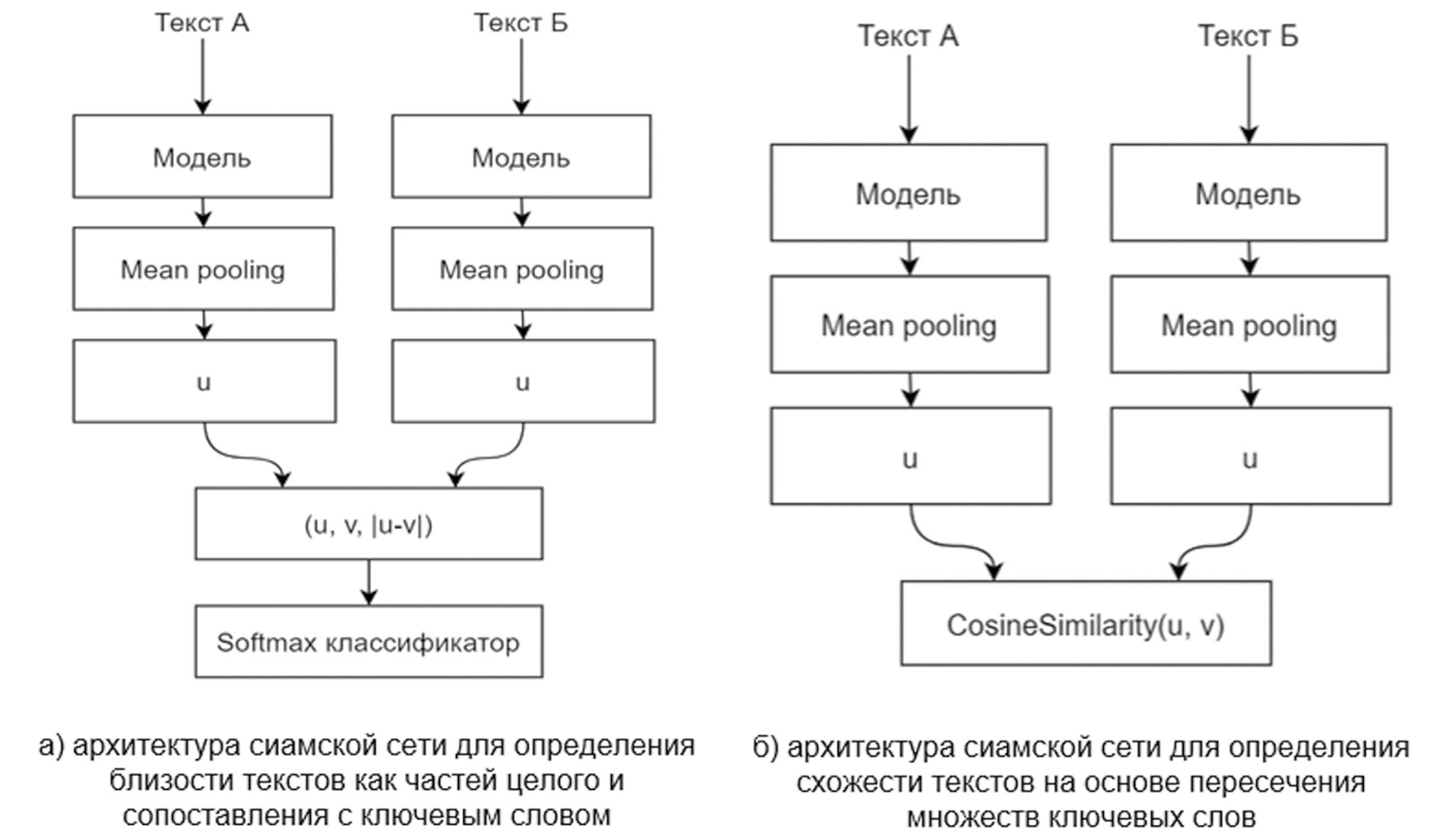 Методы. Для построения системы семантического поиска необходимо обучить модель, которая бы переводила все документы в векторное представление. В качестве моделей для векторизации будут выступать языковые модели BERT (модель кодирующего трансформера) [1], RoBERTa (улучшенная BERT модель) [2] и MBart (модель трансформера кодировщик-декодировщик, которая хорошо себя показала на задачах отчистке текста и автореферирования) [3]. Для обучения модели векторизации был собран корпус новостных статей из разных источников: Lenta.ru, Russia Today и РИА Новости. Всего было собрано более 831 тыс. статей. Основной особенностью новостных статей является то, что при их заведении авторы и редакторы определяют тематику, рубрику и порой составляют список ключевых слов. Используя данную информацию, можно сделать автоматическую маркировку. Для обучения моделей была использована архитектура сиамской сети, которая имеет два идентичных подмодуля и единый агрегирующий вывод [4]. Модели с данной архитектурой будут тренироваться на трех задачах определения семантической близости: