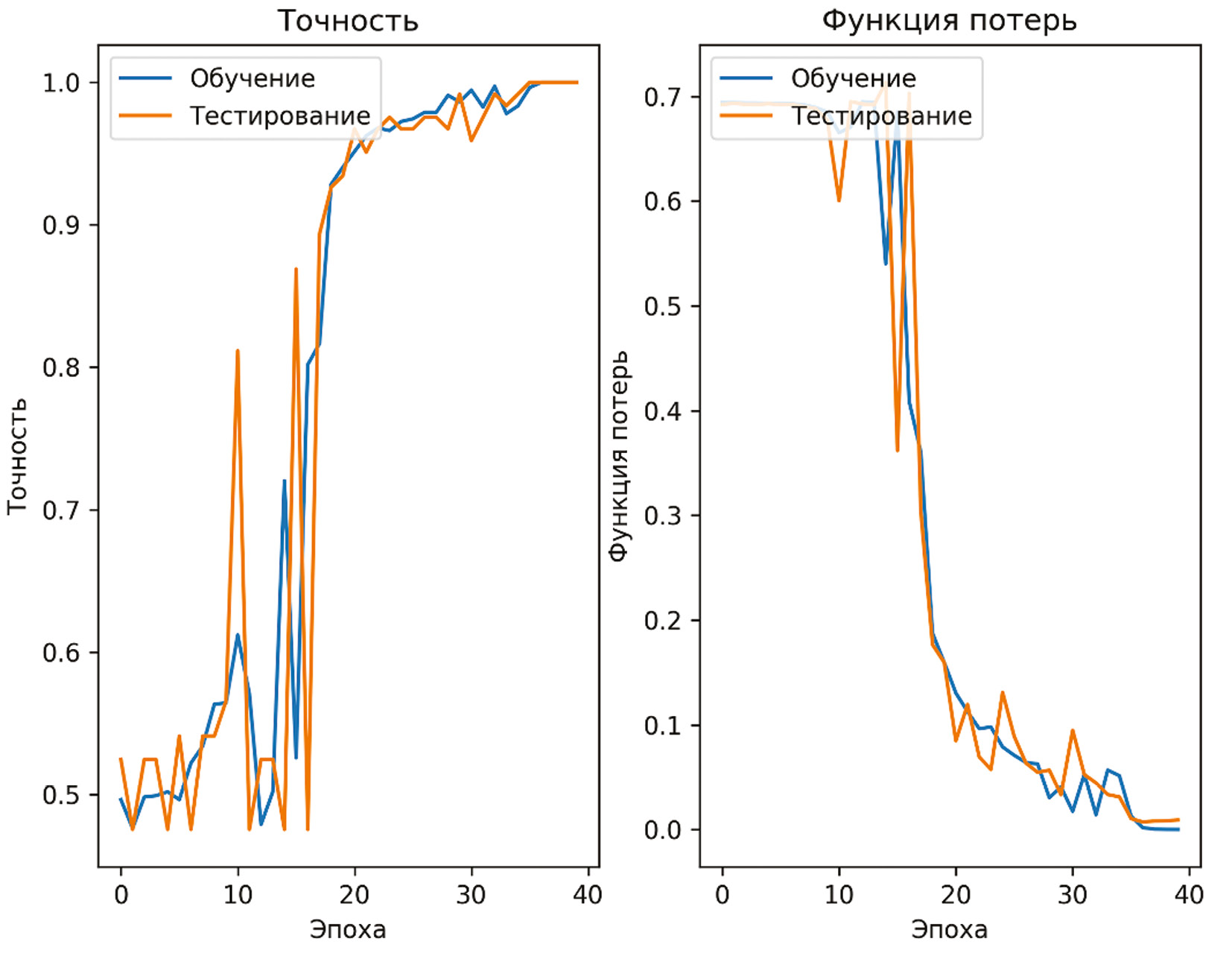 Дальнейшие изыскания были направлены на поиск оптимальных параметров обучения нейронной сети. Наилучшие результаты дал размер батча 8 и количество эпох 40. Сбалансированность количества изображений двух классов также влияет на точность, а кроме того, размер обучающей выборки желательно не ниже 1100 изображений. График точности и функции потерь детали № 5, для которой эти параметры на тестовой выборке достигли лучших значений, представлен на рис. 1.