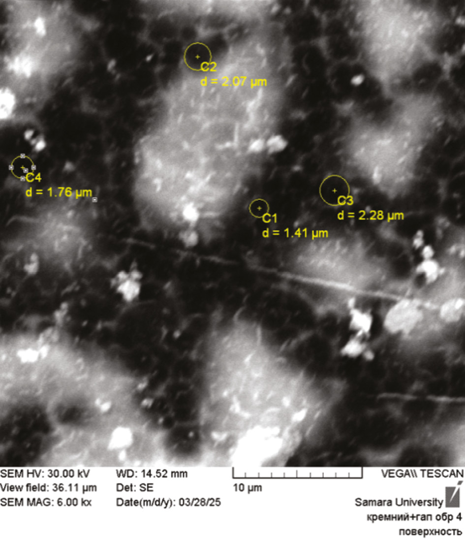Методы. Для образования пористого слоя на пластинах монокристаллического кремния КДФ с дырочной проводимостью был применен метод электрохимического травления в растворе HF:H2O:C2H5OH [1]. Время травления 5, 15, 25 мин. Плотность тока составляла 10 мА/см2. Толщину пористого слоя и размеры пор определяли методом растровой электронной микроскопии на аппарате «Tescan Vega SB». Насыщение образцов гидроксиапатитом происходило путем приготовления водной суспензии. Создание водной суспензии ПК + ГАП выполнено методом лазерной абляции [2]. Наличие гидроксиапатита в образцах определяли методом энергодисперсионного анализа [3].