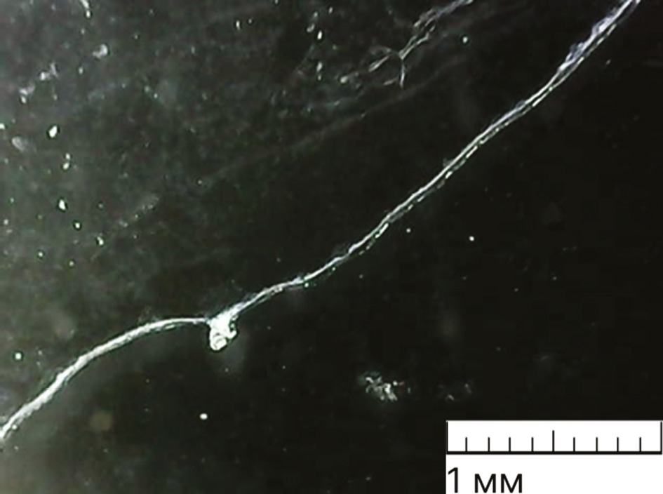 Методом лазерной абляции в воде была получена водная суспензия ПК + ГАП, которая наносилась на предметные стекла и подвергалась сушке. При помощи оптического микроскопа было выяснено, что в свежеприготовленной суспензии концентрация ПК + ГАП выше, чем в суспензии, выстоянной неделю (рис. 2, 3).