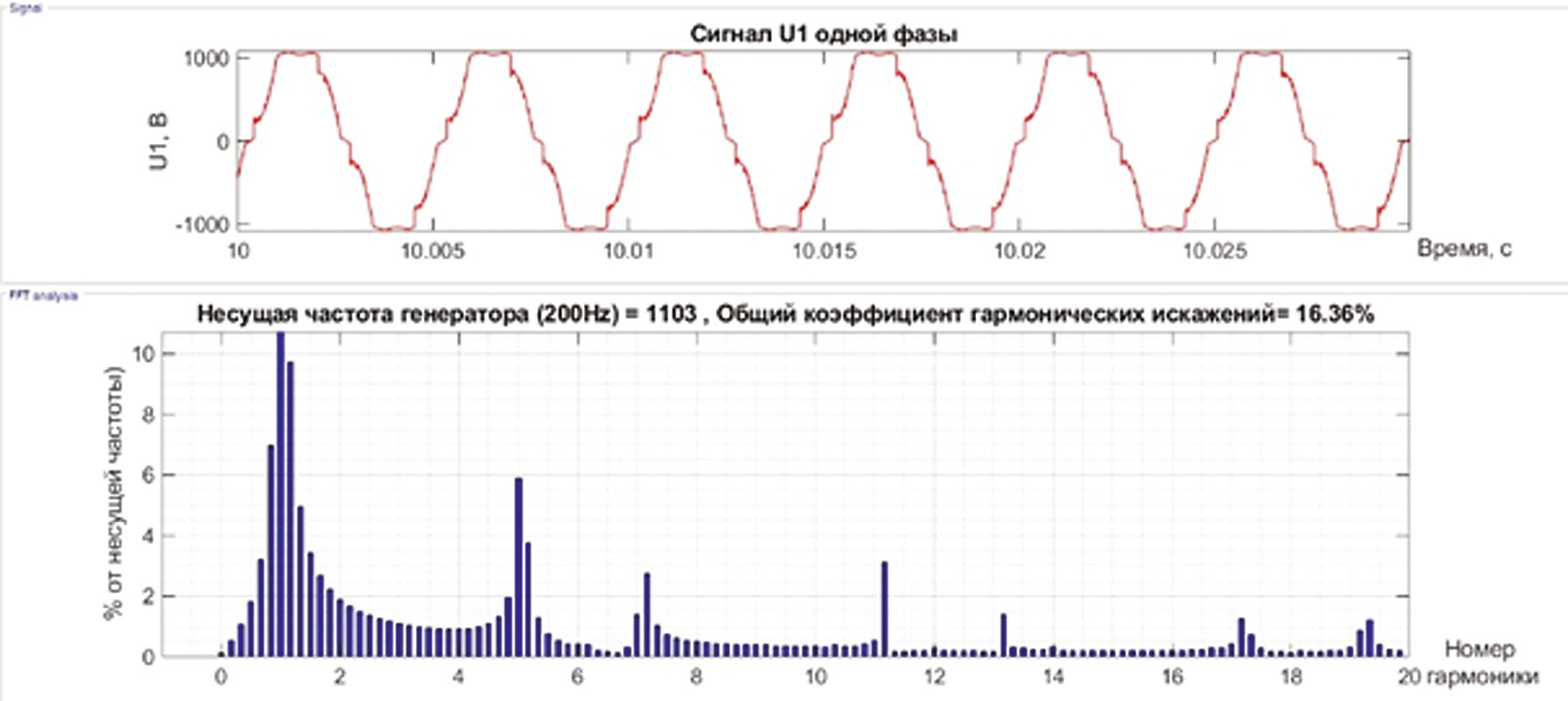 Результаты. Активный выпрямитель на базе управляемых ключей (IGBT) используется в качестве регулятора напряжения и уменьшает негативное влияние преобразователя частоты на гармонический состав источника. На рис. 2 изображен гармонический состав напряжения на статоре СГПМ с использованием активного трехфазного выпрямителя. Большая часть исследований по данной теме опубликована в трудах конференций и научных журналах [2–4].