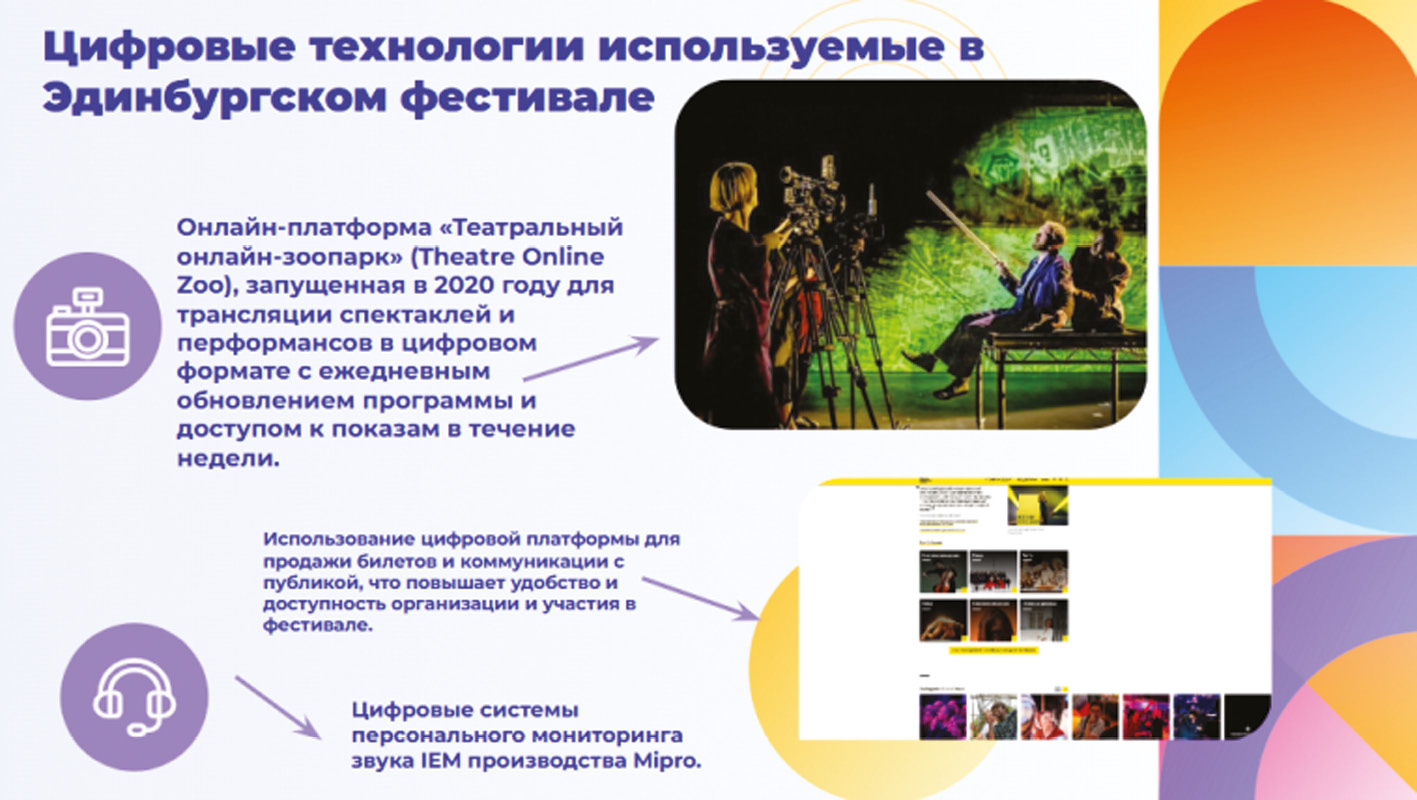 Методы. Был использован аналитический метод — для обзора тенденций и этапов цифровизации театра, [4] а также контент-анализ и кейс-стади — для изучения конкретных случаев и выявления успешных практик мирового опыта, например, были разобраны примеры успешных цифровых театральных фестивалей (Авиньонский и Эдинбургский фестиваль см. рис. 1, с анализом используемых технологий, организационных моделей и способов взаимодействия с аудиторией [1, 2].